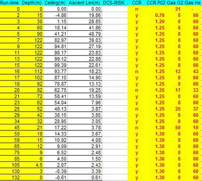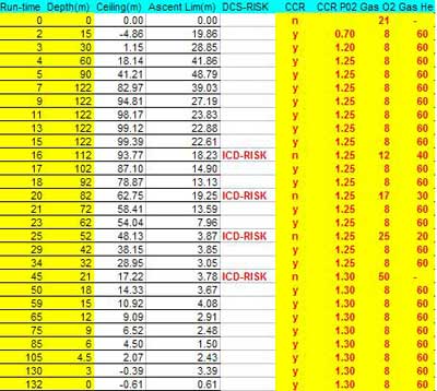 analysis program. Below are two screen grabs from an early incarnation of DecoChek highlighting ICD warnings. The dive profile is effectively 122 metres for 7 minutes. Image on left shows ICD warnings triggered by OC bail-out switches from CCR containing insufficient Helium and a subsequent jump in END at the ceiling. The image on the right has had Helium optimised in the breathing mixtures to minimise Narcotic Jumps. DecoChek comes in OC and/or CCR formats and will optimise the dive plan before you dive it. In the examples below you will see that the closer the stops come to the 'ceiling' the less END latitude is available. The subsequent release of Decochek automates the Helium recommendations offering advice as to minimum Helium levels in future gas switches.
