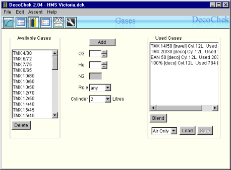 The Gases screen is where you select and edit gases for the dive. The left hand side shows the available mixes, while the right hand side shows what you're currently carrying. Click on a gas from either side then click the 'Add/Remove' button to add or remove gases from your current selection.