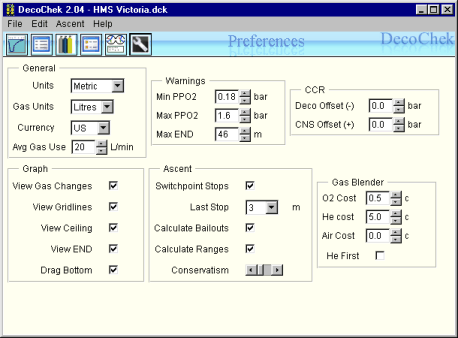 The 'PPO2 Max' control on the same screen allows you to select your maximum decompression PPO2 value for the total ascent, or just a portion. Most users will maintain a value of 1.6 (bar) but lower values may be advisable to stay within CNS clock limits.